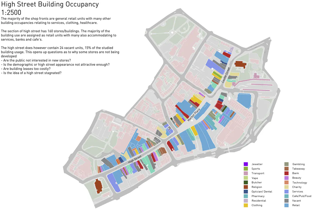The section of high street has 160 stores/buildings. The majority of the building use are assigned as retail units with many also accommodating to services, banks and cafe’s.