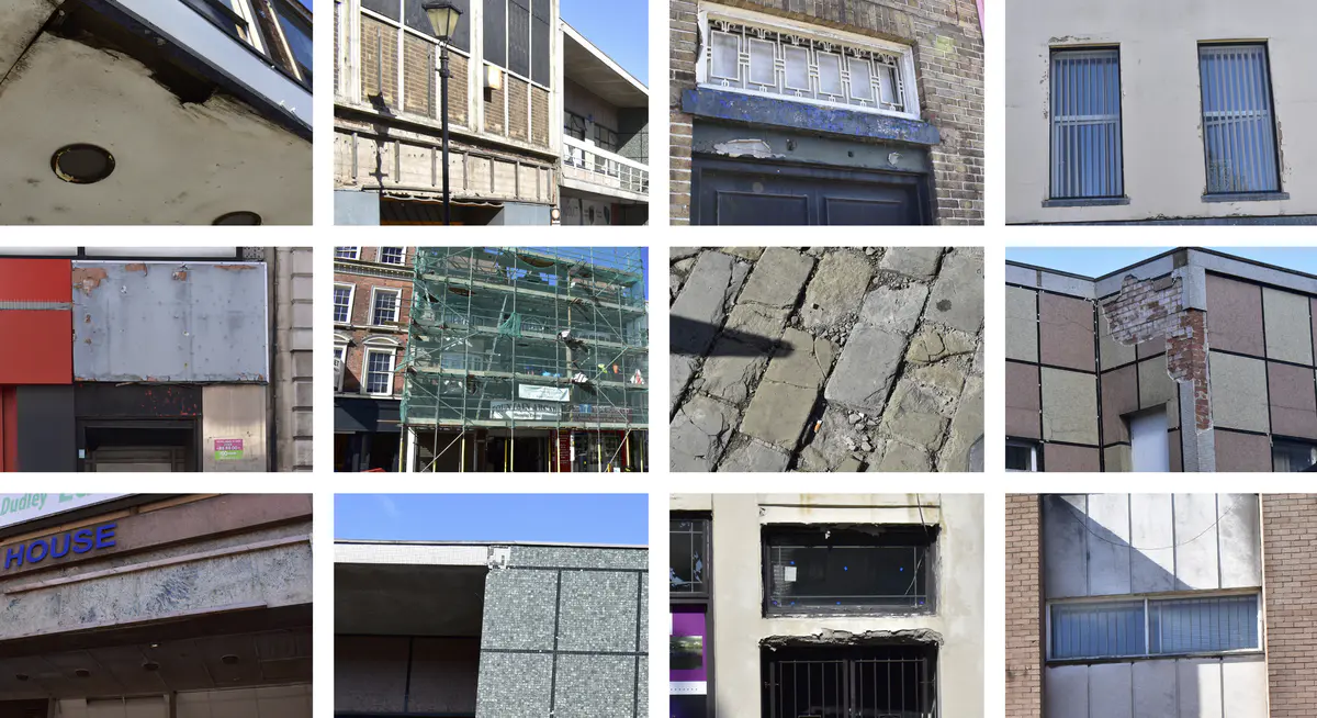 There was a familiar aesthetic regarding the buildings during the initial site visit to Dudley High Street. However, a large proportion of the façades that look onto the street have noticeable damage, graffiti or structural issues.