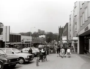 "Dudley High Street looking towards Lower High Street and Bottom Church in September 1983."