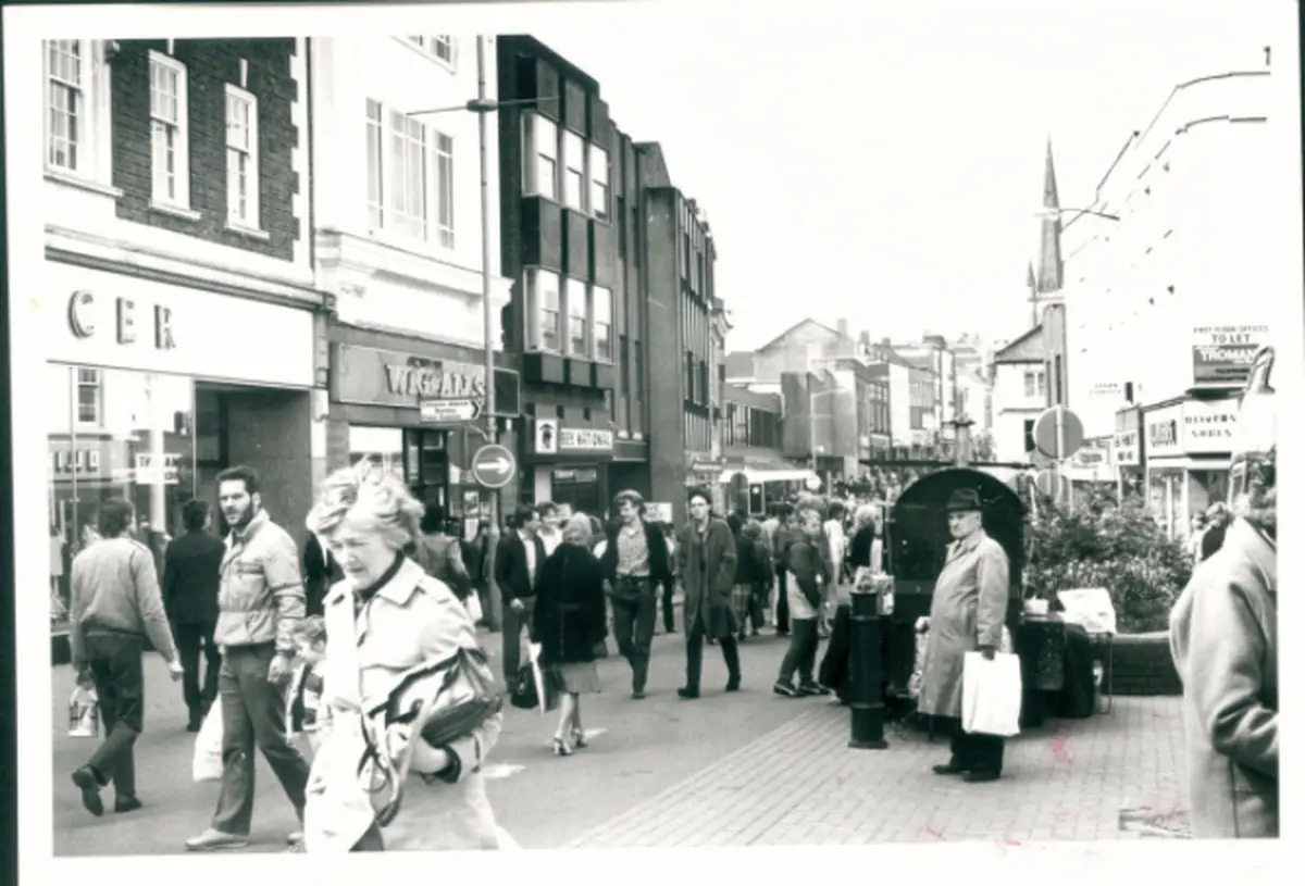 "Dudley High Street, pictured in the mid 1980s when Cooks department store was a major focus of the town."