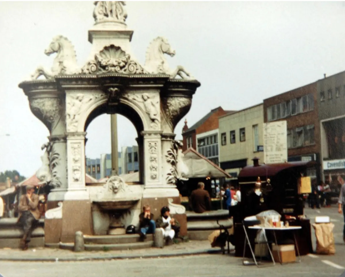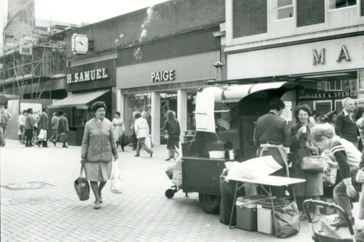 "Ted North ran his Black Country Bakes traditional baked potato business in Dudley High Street for decades.This is his potato baker stall in 1982."