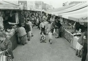 "The new market in Dudley market place in 1983 had a little more aisle space between the stalls, making shopping easier for customers. The market had just reopened after three months spent in Stone Street while it was refurbished. Traditionalists had bitterly attacked the replacing of wooden stalls with metal and the removal of the old-fashioned cobbles. This was taken on May 15, 1983."