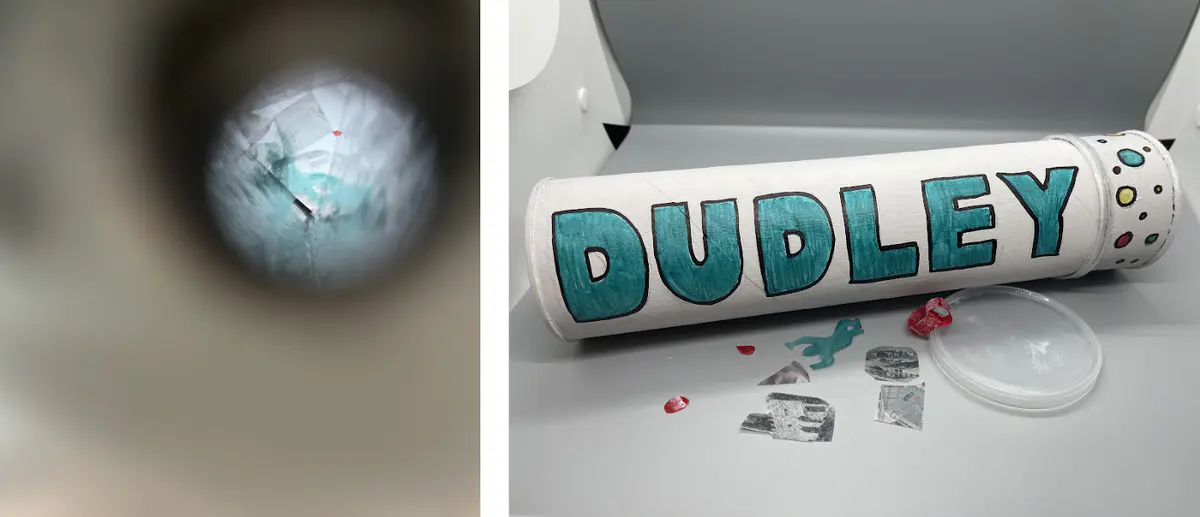 After investigating the history, heritage, culture and institutions of Dudley and its High street, I made a kaleidoscope gift based around the themes ‘overlooked’, ‘resilience’ and ‘layered’. Although sight is the most immediate sense in which many people engage with their surroundings, it’s not until you look beneath the surface and start to see things from a new perspective that you fully appreciate what is there and the potential beyond. I wanted people to engage with my gift, have fun and evoke a sense of nostalgia, whilst also using it as a way to look forward to what the High Street could be, all the while embodying the CoLab Dudley principle of allowing this object to be a co-op piece. The gift relates to the people and allows for each user to interpret and express their own thoughts.