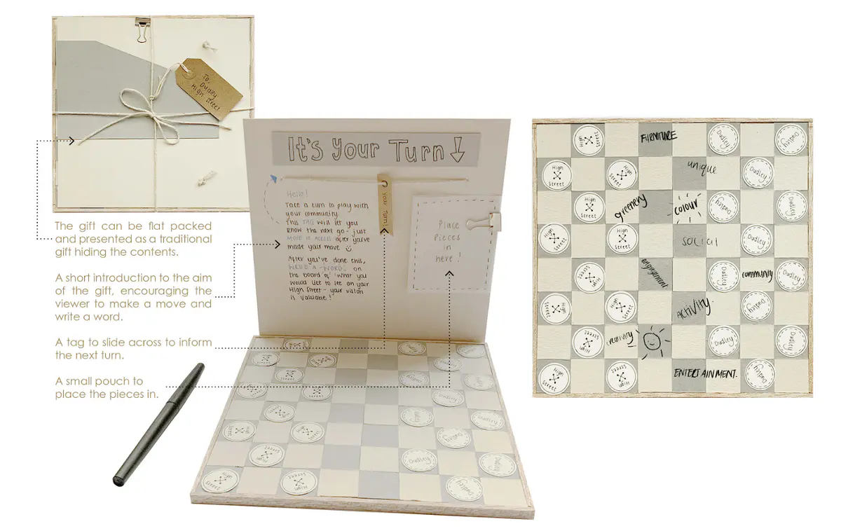 This gift aims to address the disconnect between Dudley and its industrial history. Once the ‘Capital of the Black Country’ its high street now looks like any other. With the intention of public engagement, this gift could be handed out at CoLab Dudley’s base. Starting from there, people would be able to follow the map and visit the places marked by stars — all of which hold some historical significance whether it be the location of an old factory or school — where one missing puzzle piece may be located. Only after visiting these locations would they be able to complete the puzzle and see the final image of Dudley’s high street.