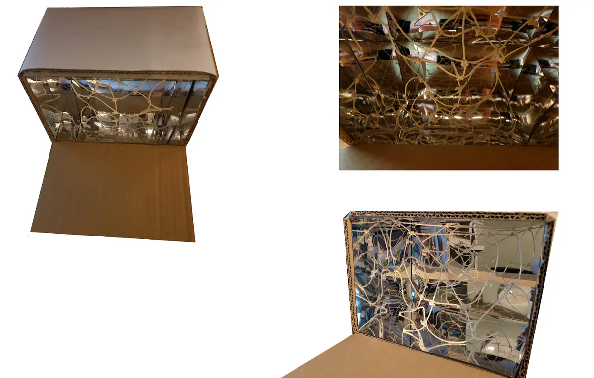 A cardboard box that when opened shows mirrors in all internal faces reflecting a web made with strings that represents Dudley as a complex system of interconnected elements. The Dudley High street has lack in colour, public spaces, and green areas, reflecting the local population that is experiencing deprivations and vice versa. Making a high street attractive can improve the local population in health, social and economic aspects.