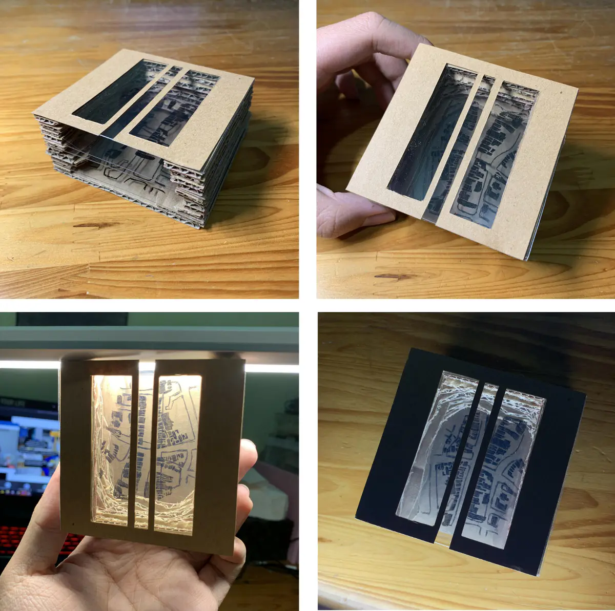 This gift is made of cardboard and acrylic. A map of the High Street is drawn on the acrylic sheet, and the distribution of buildings and roads are drawn on different acrylic sheets. Through my research, I know that the annual precipitation rate in Dudley is very high, but from the photo, there is no place to block the rain beside the buildings on the street, so I want to add the element of the poncho and make it transparent, so that it will not block the sun, and it is also more convenient for people to travel.