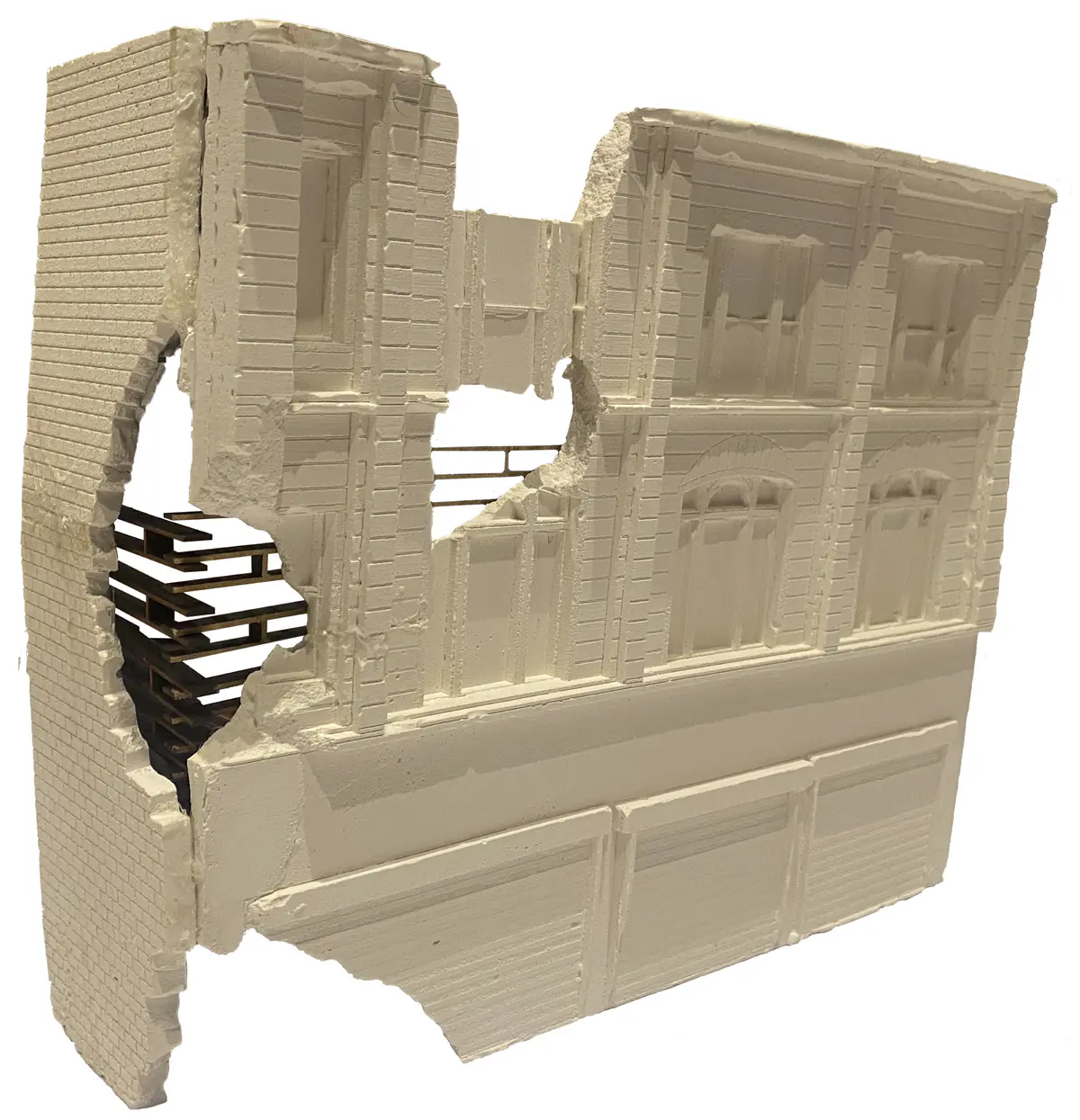 This second model uses the Shou Sugi Ban method of charring timber to waterproof it. In this case however it represents the embodied carbon and pollution within the highstreet as it exists now. The simplicity and repetition is also used to symbolise the plain nature of the highstreet with only a few materials exhibited, mainly brick & concrete. Once burnt the timber forms were brushed with wire wool to reveal the natural grain of the wood, a visual representation of degradation of layers of buildings that are built poorly or not constructed to last longer than a generation.