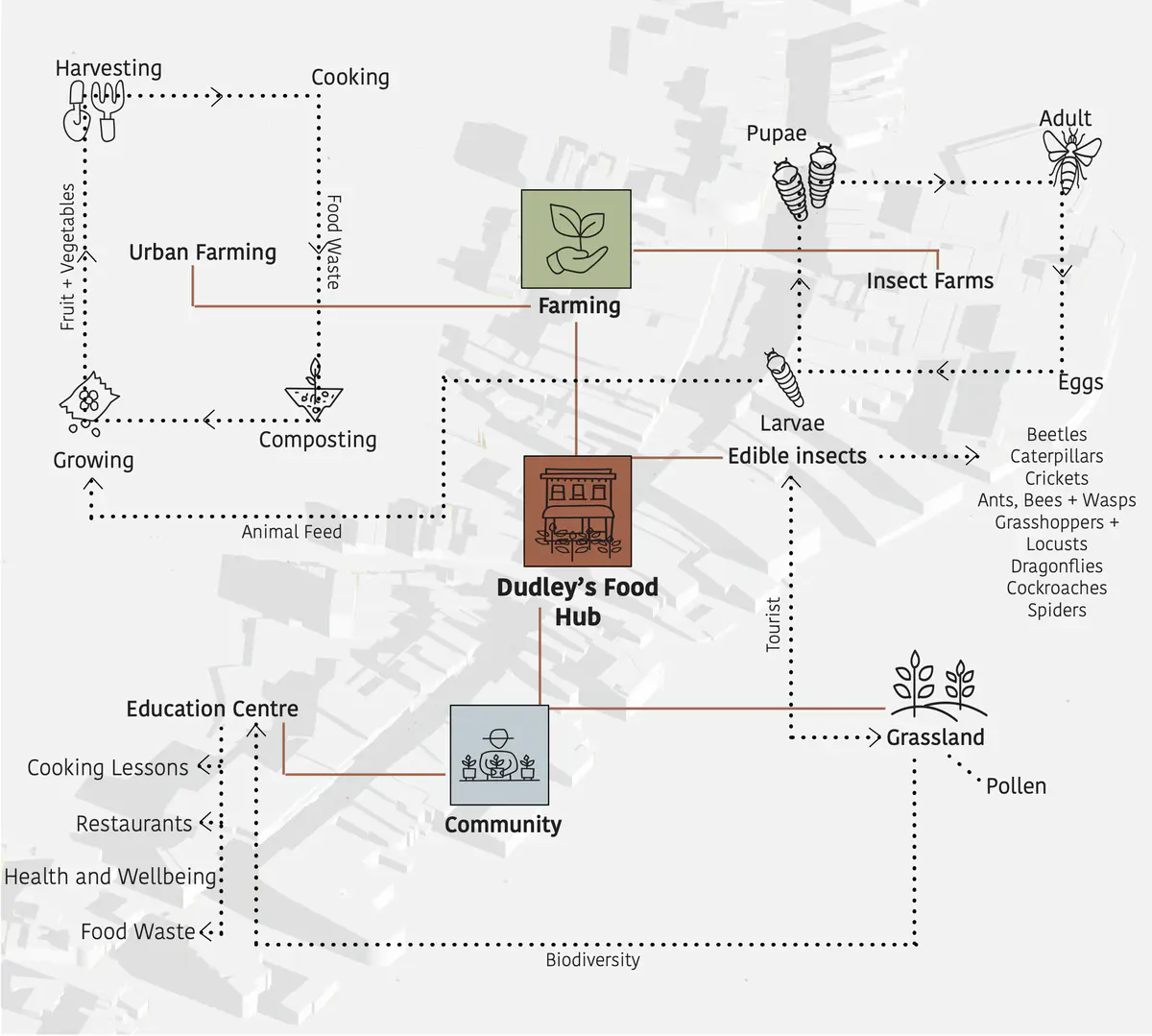 The lichen covered model looks towards a future in Dudley that is rich in texture, colour, nature and oxygen. Natural materials promote natural growth, and textures such as rough sawn timber and stone are the prefect hosts for lichen. All new buildings in Dudley would benefit massively from following a fabric first approach and adopt the use of sustainable and recycled building materials along with systems that use minimal energy.